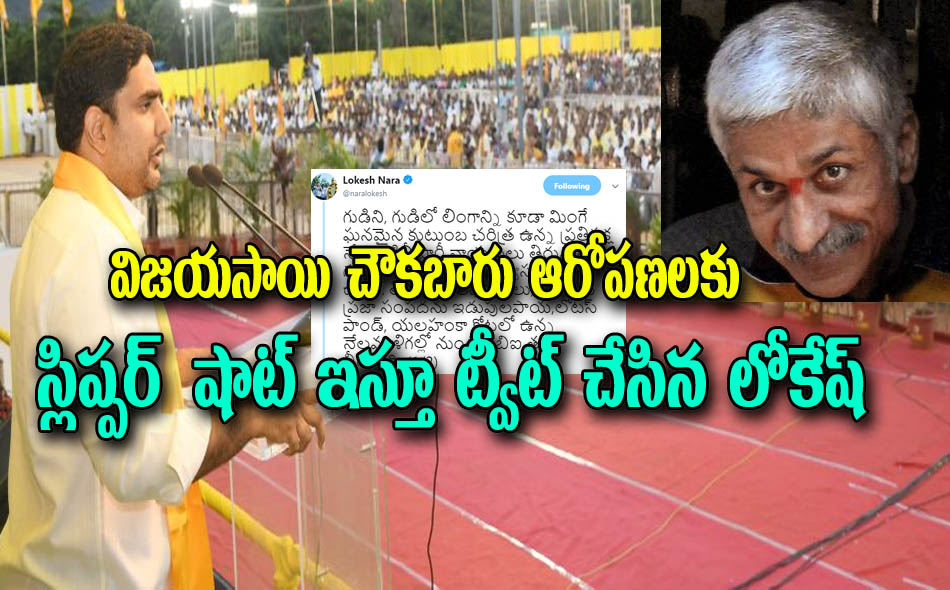 ఇది లోకేష్ ట్వీట్ "గుడిని, గుడిలో లింగాన్ని కూడా మింగే ఘనమైన కుటుంబ చరిత్ర ఉన్న ప్రతిపక్ష నేత, నకిలీ పార్టీ నాయకులు తిరుమల గురించి మాట్లాడటం హాస్యాస్పదంగా ఉంది. తిరుమల ఆభరణాలు, విలువైన ప్రజా సంపదను ఇడుపులపాయ,లోటస్ పాండ్, యలహంకా కోటలో ఉన్న నేలమాళిగల్లో నుండి సిబిఐ తవ్వి తీస్తుంది. ప్రత్యేక హోదా గురించి ప్రధానిని నిలదీసే దమ్ము, ధైర్యం లేని ఏ1, ఏ2 లు పోరాటం చేస్తున్న టీడీపీ పై బీజేపీ తో కలిసి క్విడ్ ప్రో కో రాజకీయాలకు తెర లేపారు.గతంలో తిరుమల జోలికి వచ్చిన వారు ఎక్కడ ఉన్నారో మీకే బాగా తెలుసు. " అంటూ లోకేష్ ట్వీట్ చేసారు.. రెండు రోజుల క్రితం జగన్ మోహన్ రెడ్డికి కూడా ఇలాగే ట్విట్టర్ లో చురకలు అంటించారు... దేవుడి పేరుతో రాజకీయాలు చేస్తున్న వారికి, ఇలాగే సమాధానాలు చెప్పాలి...