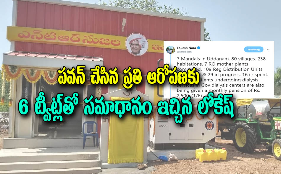నిజానికి పవన్ ఆపరేషన్ గరుడలో, బీజేపీ పావు అని, అతనకి అనవసర ప్రాధాన్యత ఇచ్చి, అతను మాట్లాడే మాటలకు రియాక్ట్ అవ్వద్దు అని, జగన్ లాగే, ఇతన్ని కూడా వదిలేయమని టిడిపి నాయకులకు ఆదేశాలు వెళ్ళాయి.. అయితే, పవన్ మరీ దిగాజారి, ఆరోపణలు చెయ్యటం, ప్రజలు నిజం అని నమ్మే అవకాసం ఉండటంతో, లోకేష్ ట్విట్టర్ ద్వారా స్పందించారు... ఇవి లోకేష్ ట్వీట్లు... "పవన్ కళ్యాణ్ గారికి తప్పుడు సమాచారం ఇవ్వడం ద్వారా కొంతమంది తప్పుదోవ పట్టిస్తున్నారు... కిడ్నీ సమస్య ఉన్న పలాస,వజ్రపు కొత్తూరు,కవిటి,సోంపేట,కంచిలి,ఇచ్ఛాపురం,మందసా ల్లో సుమారుగా 16 కోట్ల నిధులతో 7 ఎన్టీఆర్ సుజల మదర్ ప్లాంట్స్ ఏర్పాటు చేసాం... వీటి ద్వారా 80 గ్రామాల్లో 238 నివాస ప్రాంతాలకు సురక్షిత తాగునీటి సరఫరా జరుగుతుంది..."