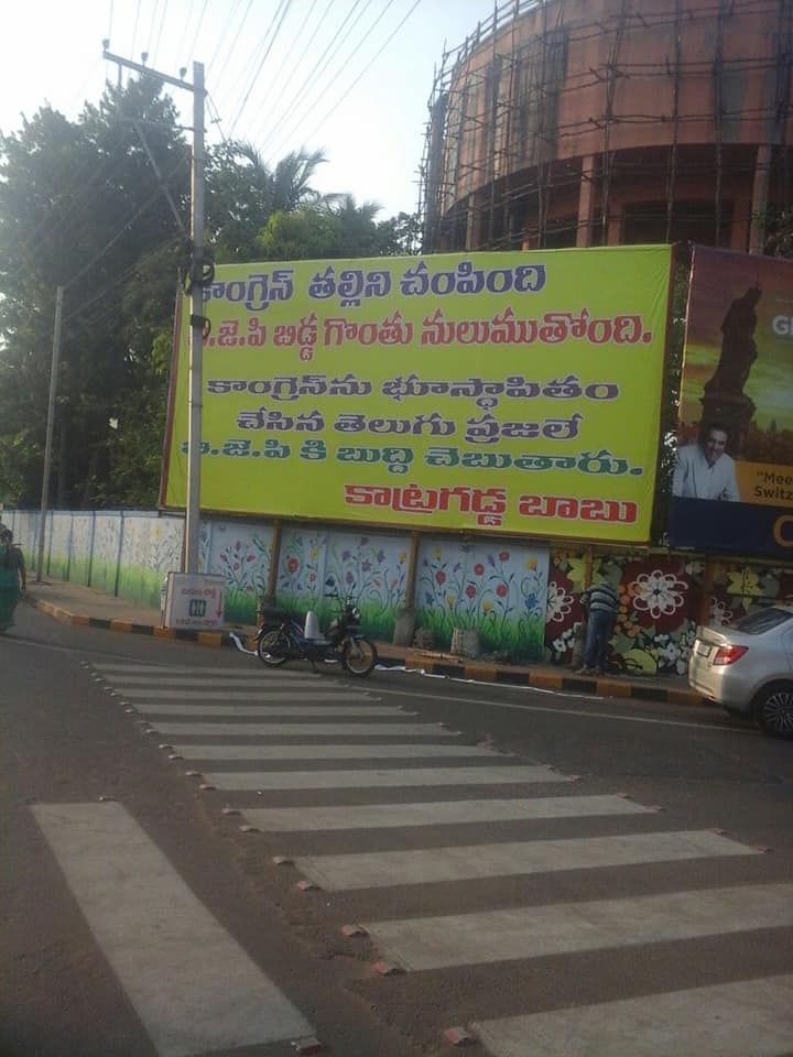 పోయిన వారం ఏర్పాటు చేసిన ఫ్లెక్స్ లో ఇలా ఉంది... "ఆనాడు కాంగ్రెస్ పార్టీ పార్లమెంట్ తలుపులు వేసి ఆంధ్రప్రదేశ్ ను అడ్డగోలుగా అన్యాయంగా విభజించారని మీరు ఉద్వేగంతో మొన్న లోక్ సభలో చెప్పారు. దానికి మా కృతజ్ఞతలు.. మీరు ఈ రోజు బీజేపీ పాలనలో టీడీపీ తలుపులు బార్లా తెరిచి , విభజన హామీలను తుంగలో తుక్కుతున్నారు. దీంతో మా తెలుగు ప్రజలు భావోద్వేగంతో అందోళన చెందుతున్నారు. వాడవాడలా ఆవేదనతో గగ్గొలు పెడుతున్నారు. ఇప్పటికైనా మా హామీలు నెరవేర్చండి లేకుంటే జాతి మిమ్మల్ని క్షమించదు" అంటూ కాట్రగడ్డ ప్లెక్సీ ఏర్పాటు చేశారు.